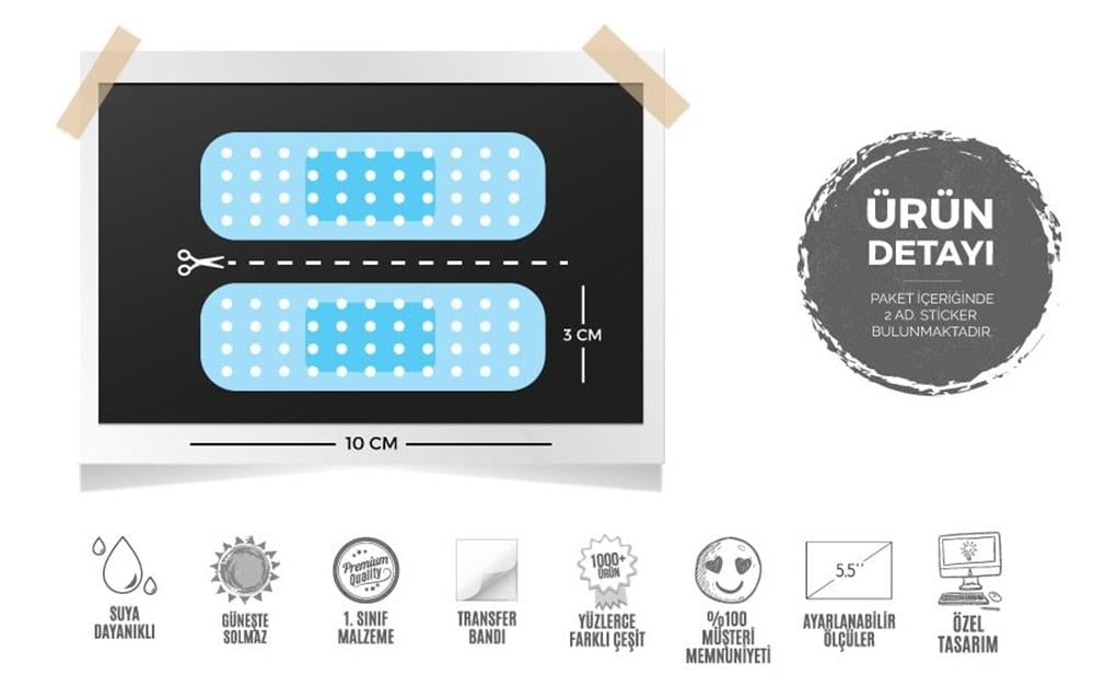 Stickerın Ölçüleri : 10 cm (Genişlik) x 3 cm (Yükseklik) Ölçüler tek bir yarabandının ölçüsüdür.