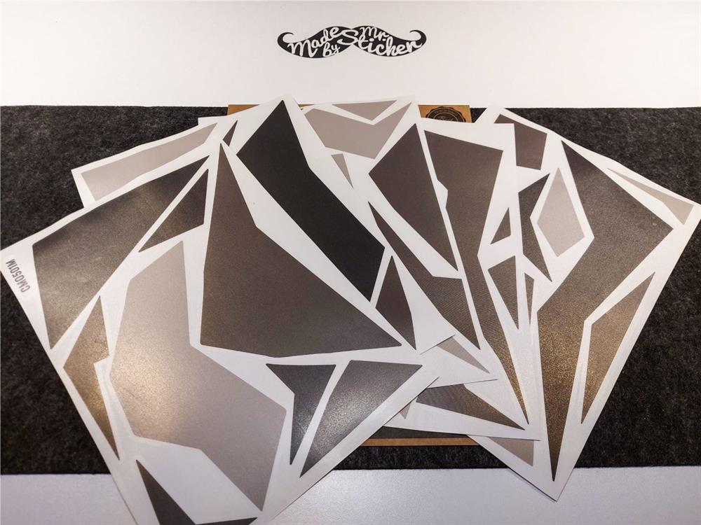 ⚠️ Bu set tek parça folyo değildir, siyah, gri, füme renklerinde 45 adet üçgen (ve benzeri) şekilden oluşmaktadır. Uygulanacak zeminin üzerini tamamen kaplamak (tamamen renk değiştirmek) için kullanılamaz.