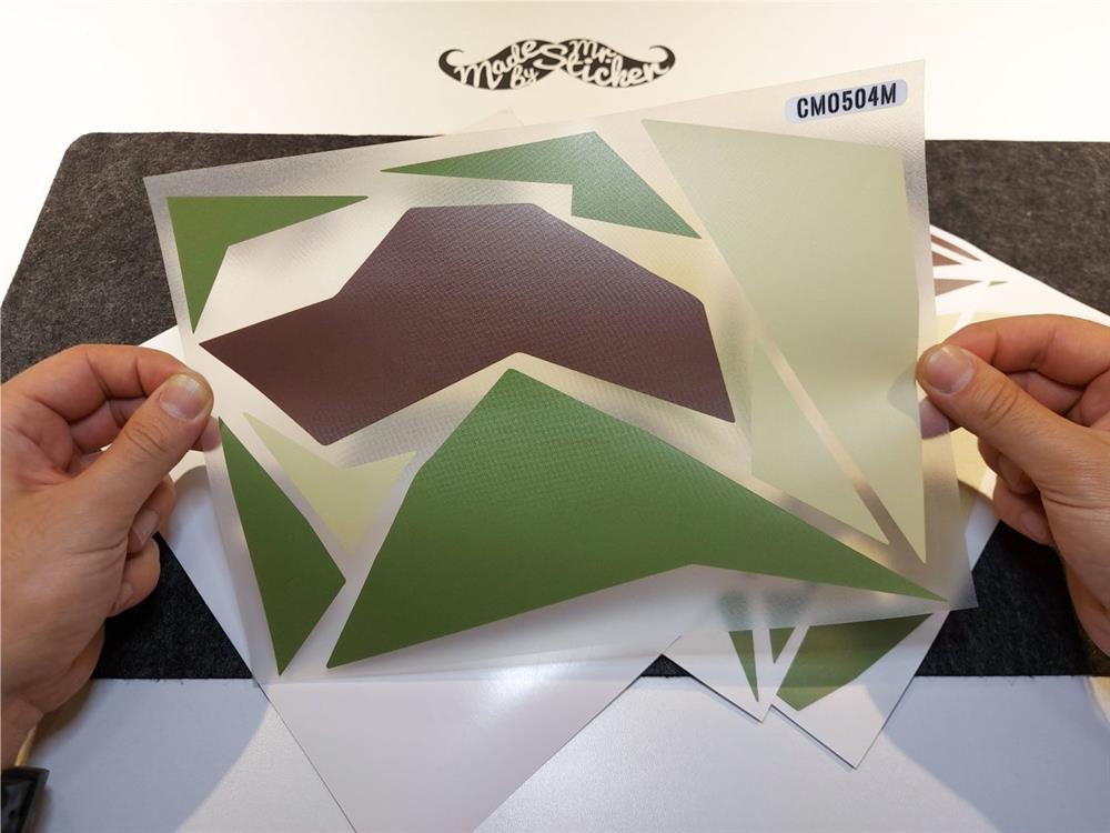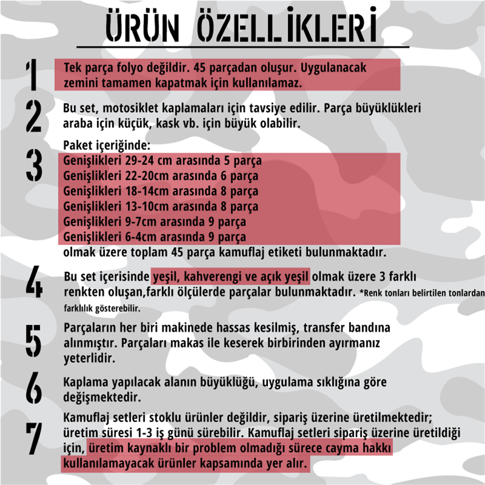 • 45 parça kamuflaj seti (ortalama) 20cm genişlik ve 28cm yükseklikte 5 sayfa olarak gönderilmektedir. Makas yardımı ile parçaları keserek ayırıp, tek tek uygulamanız gerekmektedir.