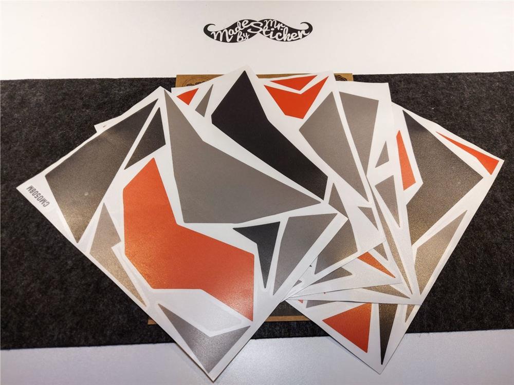 ⚠️ Bu set tek parça folyo değildir, siyah, gri, kırmızı renklerinde 45 adet üçgen (ve benzeri) şekilden oluşmaktadır. Uygulanacak zeminin üzerini tamamen kaplamak (tamamen renk değiştirmek) için kullanılamaz.