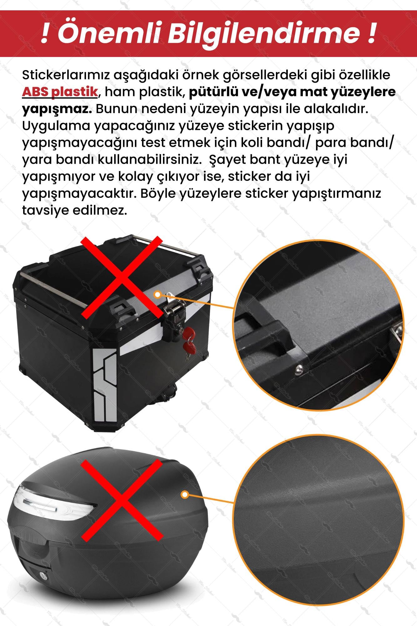 ⚠️ UYARI:  Stickerlar her yüzeye yapışmamaktadır (Özellikle ABS plastik, pütürlü ve/veya mat yüzeylere yapışmayabilir). Pasta/Cila ya da hızlı cila gibi yüzeye parlaklık veren kimyasalların uygulandığı yüzeylere de sticker yapışmamaktadır. Şayet yüzeyde bu tür bir uygulama var ise yüzeyin çok iyi temizlenerek kimyasaldan arındırılması gerekir. Hangi yüzeylerin sticker yapıştırmaya elverişli olduğunu görmek için "Uygulama Yüzey Seçimi" bölümünü okuyunuz.