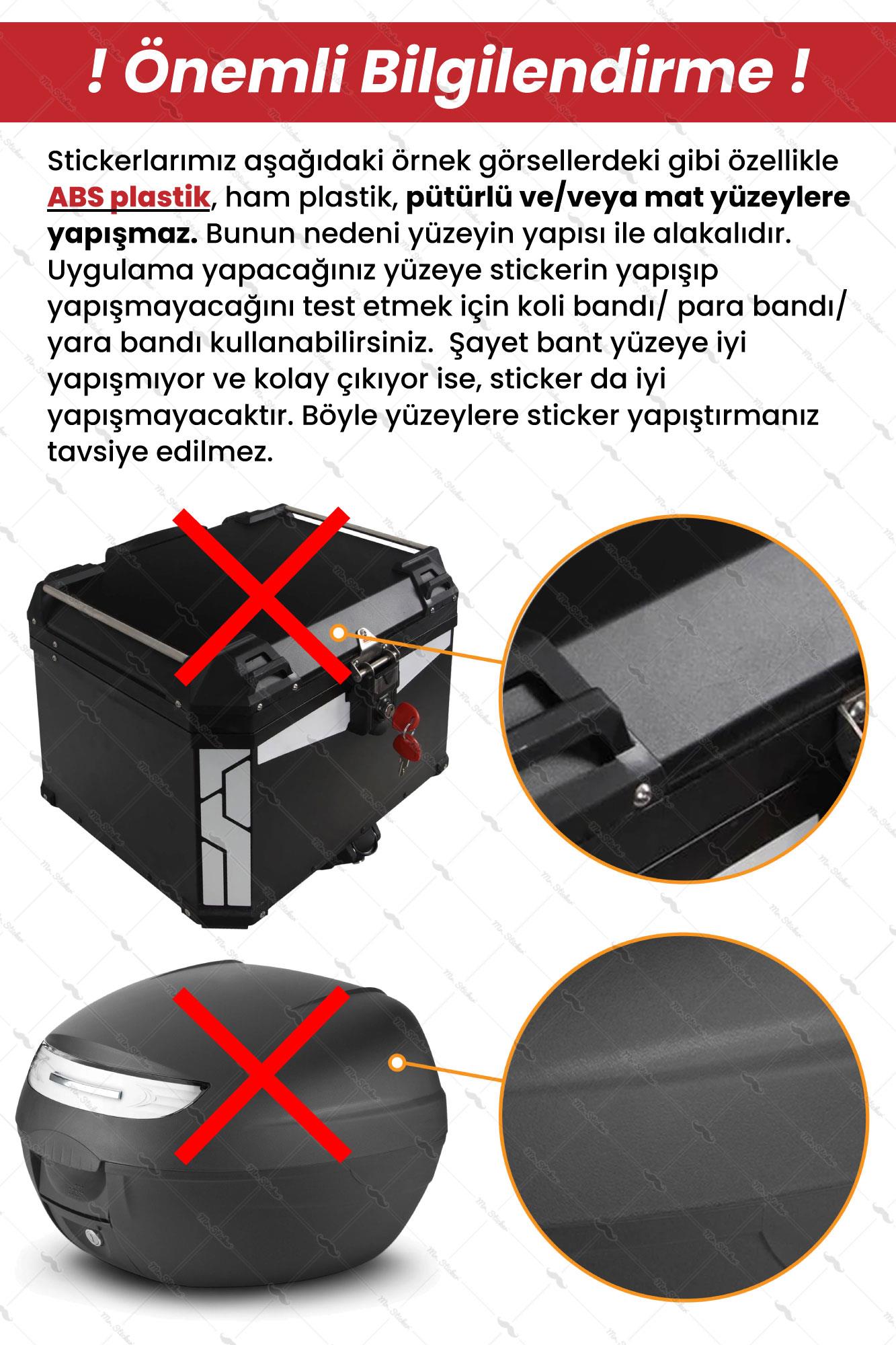 ⚠️ UYARI : Stickerlar her yüzeye yapışmamaktadır (Özellikle ABS plastik, pütürlü ve/veya mat yüzeylere yapışmayabilir ) . Pasta/Cila ya da hızlı cila gibi yüzeye parlaklık veren kimyasalların uygulandığı yüzeylere de sticker yapışmamaktadır. Şayet yüzeyde bu tür bir uygulama var ise yüzeyin çok iyi temizlenerek kimyasaldan arındırılması gerekir. Hangi yüzeylerin sticker yapıştırmaya elverişli olduğunu görmek için "Uygulama Yüzey Seçimi" bölümünü okuyunuz.