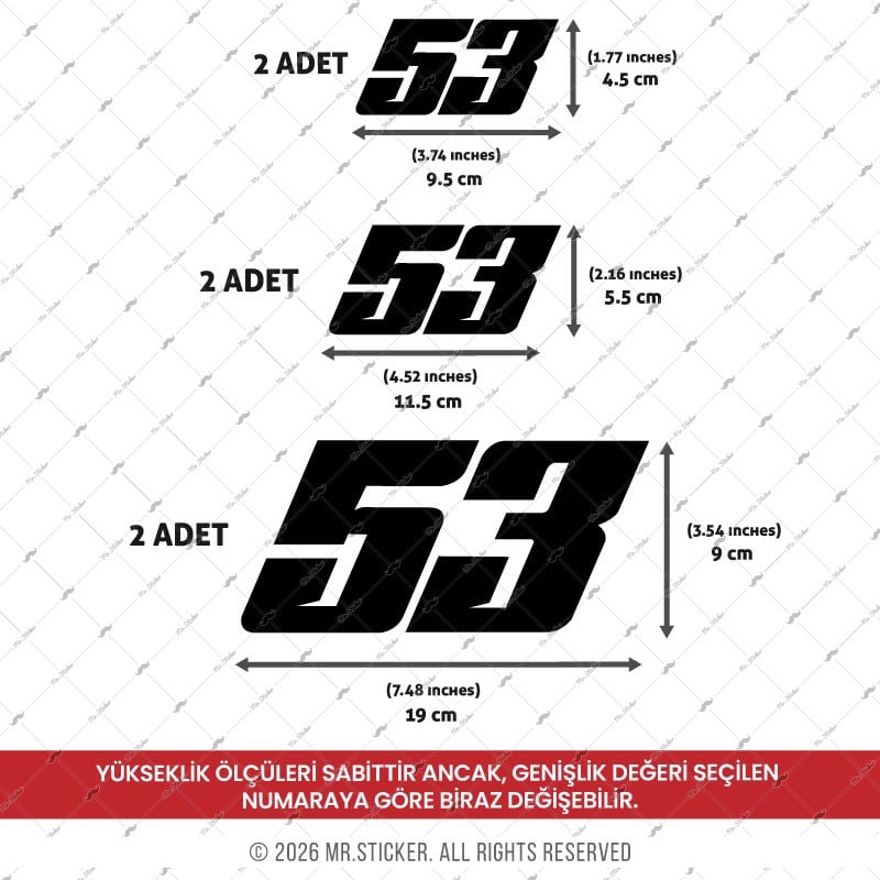 En Küçük Boy Sticker: Genişlik numara seçimine göre değişmektedir (Ortalama genişlik 9.5 cm) x 4.5 cm (Yükseklik) iki adet