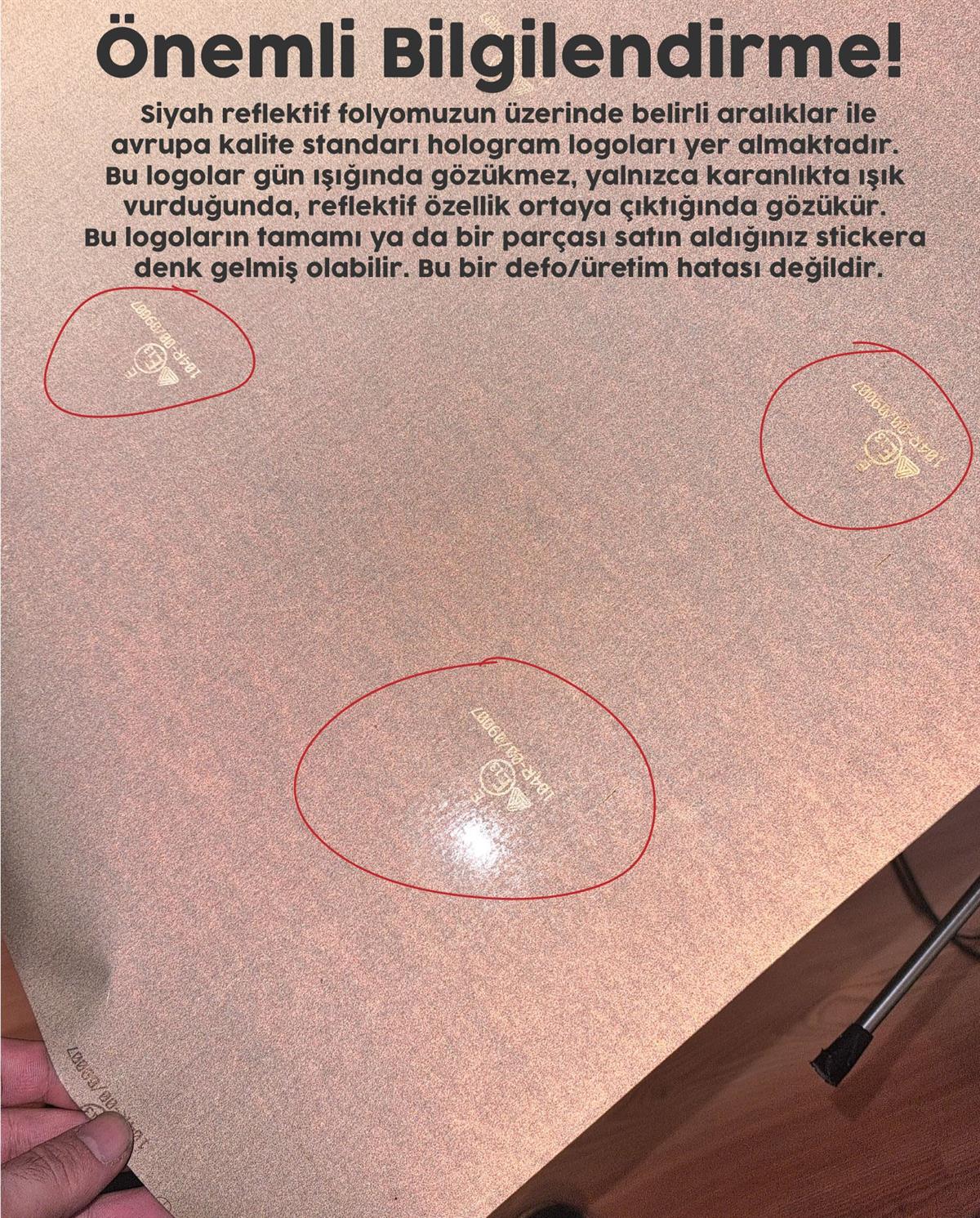 * Stickerınızın reflektif özellğini test etmek için stickerınızı yere bırakın. Telefonunuzun flaşını açın ve bel hizanızdan stickerın tam üzerine gelecek şekilde tutun. Telefonunuzu sola ve sağa yavaşça hareket ettirirken stickerın parladığını göreceksiniz. Stickerınızı bir yüzeye yapıştırdığınızda transfer bandı da kalkmış olduğu için daha da iyi parladığını göreceksiniz.