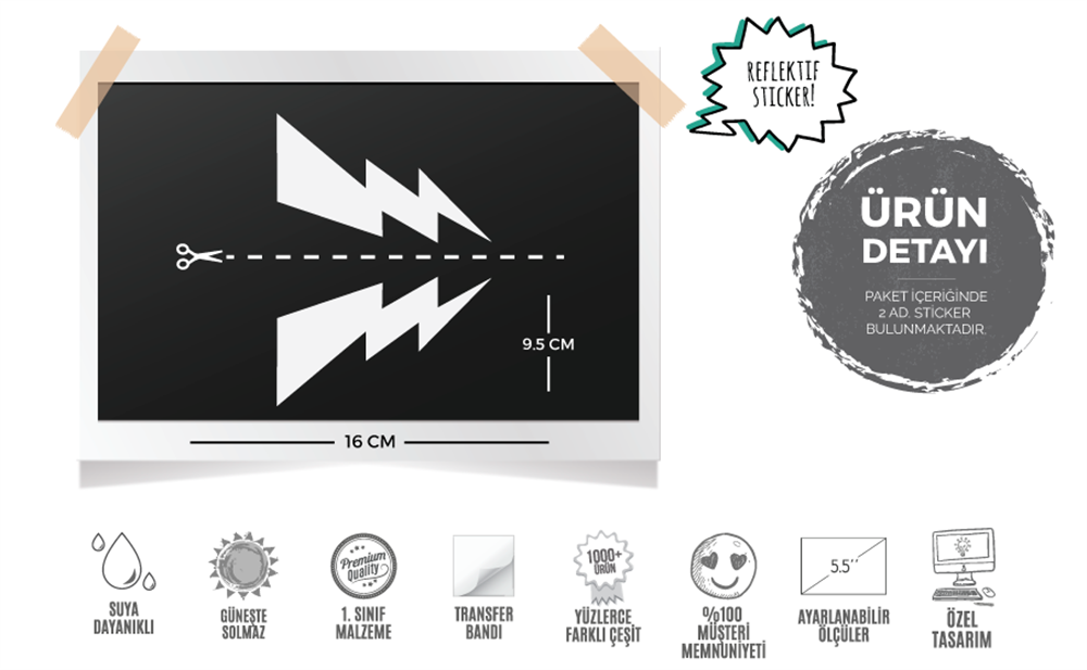 ⚠️ UYARI: Stickerlar her yüzeye yapışmamaktadır (Özellikle ABS plastik, pütürlü ve/veya mat yüzeylere yapışmayabilir). Pasta/Cila ya da hızlı cila gibi yüzeye parlaklık veren kimyasalların uygulandığı yüzeylere de sticker yapışmamaktadır. Şayet yüzeyde bu tür bir uygulama var ise yüzeyin çok iyi temizlenerek kimyasaldan arındırılması gerekir. Hangi yüzeylerin sticker yapıştırmaya elverişli olduğunu görmek için "Uygulama Yüzey Seçimi" bölümünü okuyunuz.